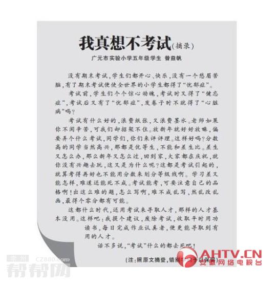 小学生神作文再现 “我真不想考试”几近满分