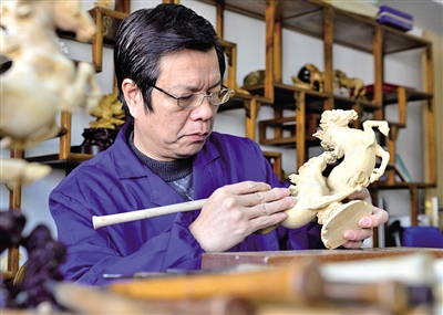 昨天上午,记者走进了叶萌春的工作室。只见他手握刻刀,在双奔马的毛坯上精雕细琢,一会儿功夫,马儿昂首扬鬃、扬蹄卷风的奔腾之势便跃然眼前。叶萌春告诉记者,马之于他有着特殊的意义,在他艺术生涯中,很多作品都与马有关,“马代表了一种奋发向前、敏捷内秀的性格,我敬重马的忠诚、无畏和那一往无前的进取精神。”