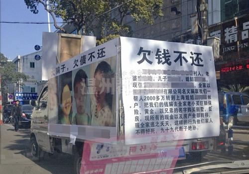 货车车身上贴着“讨债广告”并附“欠债一家人”的照片、姓名,车子被开上街,一路上喇叭里还播放着“讨债广告”。昨天,苍南龙港街头出现这样一幕。货车车主称,是一名男子把车改成“讨债车”,让他开着在镇上走一天,男子付600元。