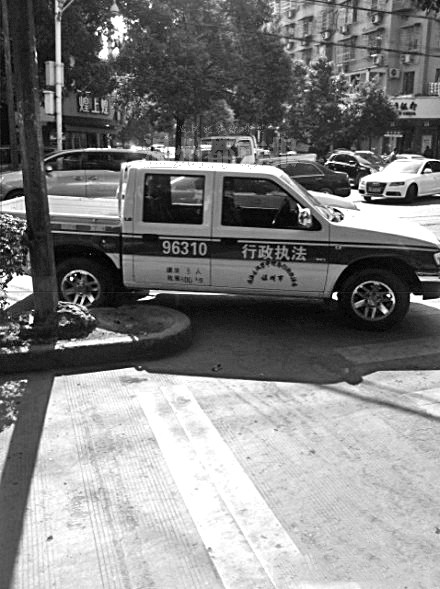 “车辆尾部朝里,斜靠在马路上,将斑马线堵住一半,拦住了行人的通行线路。”周先生说,行政执法车如此停车,实在太“牛逼”。他立即拿出手机,将这一幕拍了下来,发到微博上。