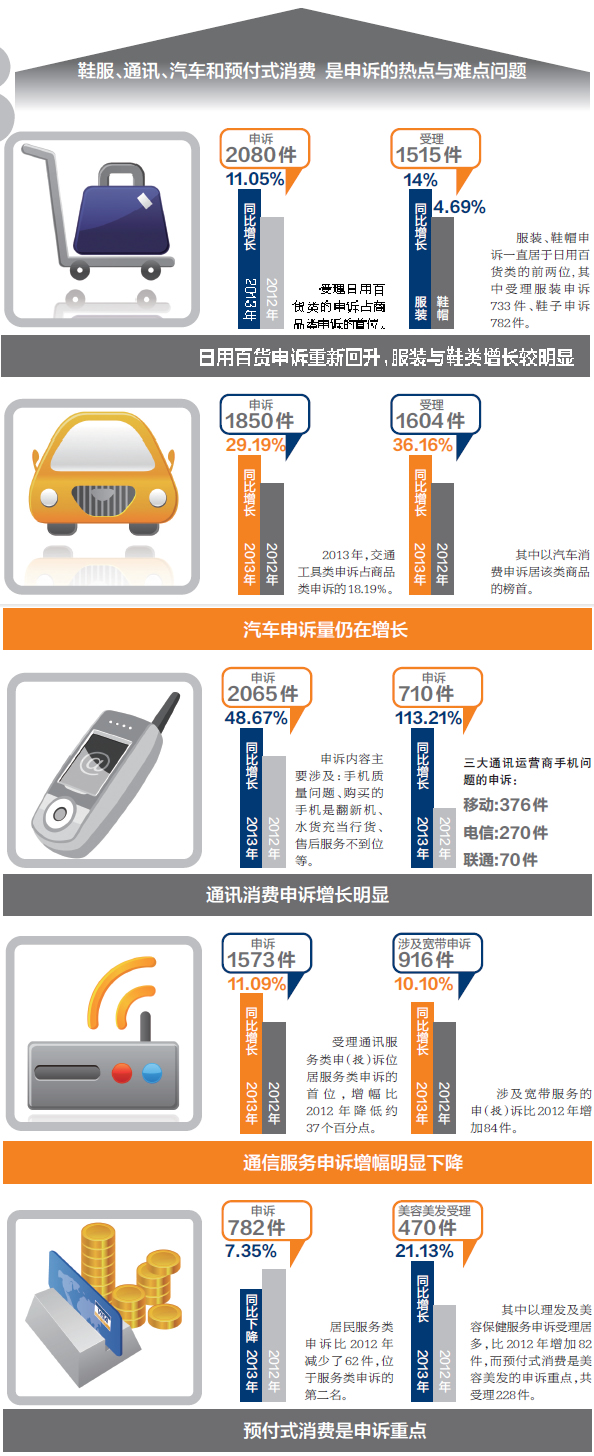去年,“12315”共接到了多少投诉电话?市民消费维权的热点又发生了哪些变化?昨天,温州市工商局12315举报申诉指挥中心发布2013年度温州市“12315”举报申诉统计分析。