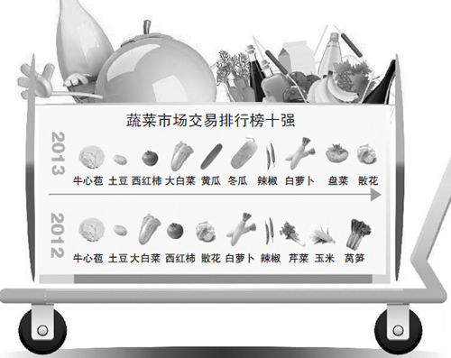 据温州菜篮子农副产品市场发布的2013年交易排行榜显示,跟前一年相比,黄瓜、冬瓜、盘菜成功“挤掉”芹菜、玉米、莴笋,晋级交易量十强,西红柿排名略有上升,大白菜、散花、白萝卜的名次则下跌不少。