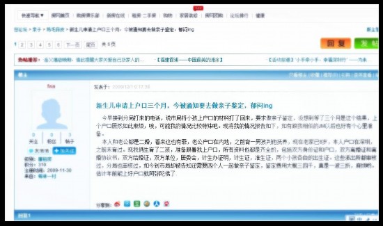 图为某论坛上最早传出网友的帖子,“今早接到分局打来的电话,说市局将小孩上户口的材料打了回来,要求做亲子鉴定,没想到等了三个月是这个结果,上个户口居然如此麻烦。”