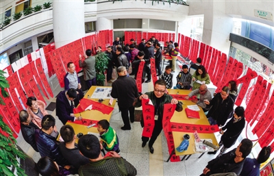昨天下午,温州日报报业集团多位书法高手在报业大厦大厅为市民撰写春联。杨冰杰摄