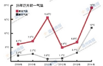 不仅今年除夕是史上最温暖,今年春节也将开启史上最温暖的模式。2009年至2013年,除2011年的正月初一最高气温有15.6℃,其他年份最高气温均在10℃以下,连续五年最低气温均在4℃以下。今年的正月初一最高气温有19℃,最低气温也有12℃。市气象台预计,正月初二至初四最高气温逼近甚至超过20℃。