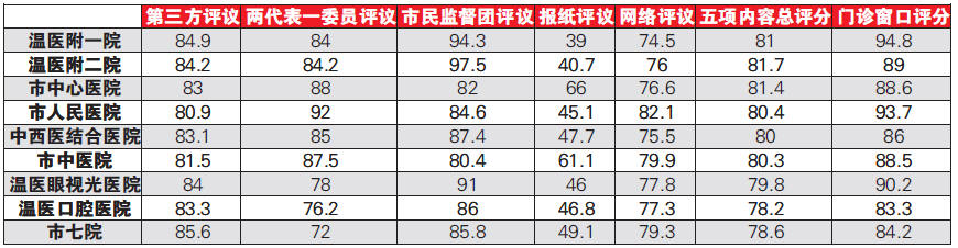 温州市卫生系统“万名群众评医院”活动评议对象为:温州医科大学附属第一医院、温州医科大学附属第二医院、温州市中心医院、温州市人民医院、温州市中西医结合医院、温州市中医院、温州医科大学附属眼视光医院、温州医科大学附属口腔医院、温州市第七人民医院共九家医疗单位(温州市第七人民医院不参与排名)。评议内容包括:医院患者第三方评议(美兰德信息公司测评)、“两代表一委员”评议、市民监督团评议、报纸评议以及网络评议五项内容。同时,九家医院门诊窗口就“门诊环境、服务流程、服务态度、工作效率”四个方面进行检查考核。现将结果公布如下: