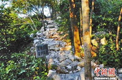 近日,记者在柳州市白岩山山顶看到,两座山峰之间有一条宽约一米五、长约200米的石头路连接。临近山顶,有一段新铺的石路,在山顶上,不同大小的石块铺起一个观景平台。