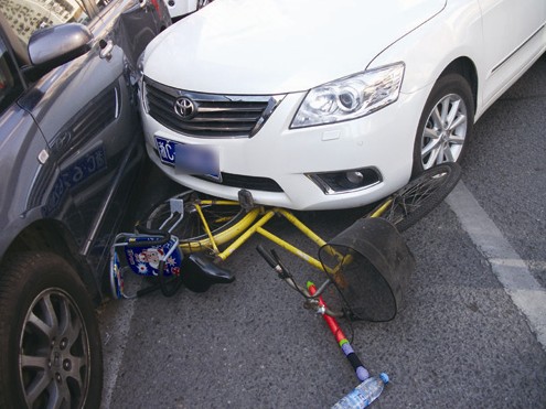 昨日下午,在温州闹市区大南门,一起追尾事故形成多米诺骨牌效应,继而发生连锁事故,造成三辆机动车损坏、一辆自行车被压在车底,一名乘坐自行车的男孩头部受伤。