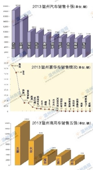 2013年,温州汽车销量排名前十的品牌分别是大众18390辆,五菱14614辆,现代9852辆,长安9365辆,奥迪8474辆,别克7760辆,日产7690辆,丰田7511辆,福特7207辆,宝马7194辆。日系三大品牌丰田、本田、日产曾经长期占据温州汽车销售排行榜的前几位,但2013年,排名最高的日产也仅仅是第七位,丰田排第八位,而本田不但跌出前十,还被雪佛兰超越,排名第十二位。而多年前,本田还曾经是傲视车市的畅销品牌。“广本”也一度被认为是高端车的代名词。但2013年本田销售汽车5475辆,不到大众的三分之一,比之后起之秀现代,本田也仅占据后者的56%。