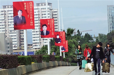 市区府西路、市府路等主干道上挂满了首届温商回归功勋人物的照片和简介。陈翔摄
