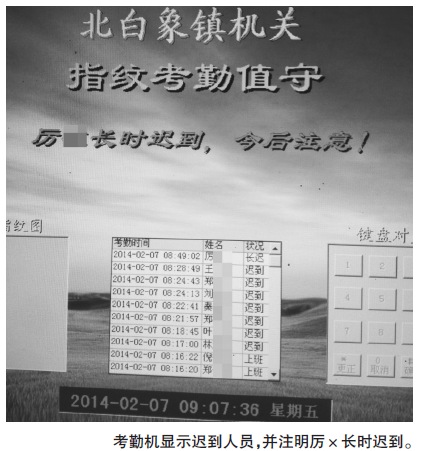 昨天上午7时55分,陆续有人来到一楼指纹考勤机上打卡。一问才知道,北白象镇机关单位上班时间为上午8时。