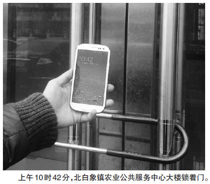 10点20分左右,当记者折回农业公共服务中心时,发现该中心所在的大楼竟然大门紧锁。过了20多分钟,才有人过来开门,但服务中心窗口仍然无人值守。