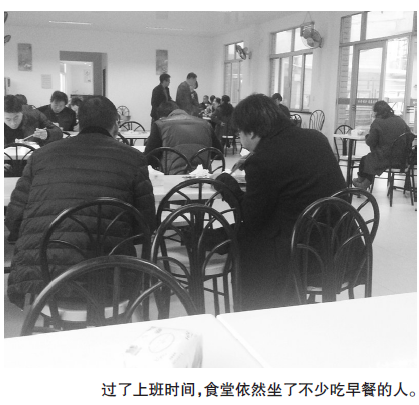 昨天上午8时30分许,早已过了考勤时间,北白象镇政府食堂仍忙着供应早餐,食堂里10余张桌椅几乎都坐着吃早饭的工作人员。