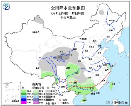 中新网2月11日电 据中央气象台网站消息,未来三天,南方地区持续低温雨雪天气。11~13日,青藏高原东部、西北地区东部、黄淮西部和南部、江淮、江汉、江南中西部、贵州等地有小到中雪或雨夹雪,其中,安徽、江西中部等地的部分地区有大雪,局地暴雪;贵州中部的部分地区有冻雨。