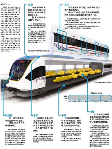 按照计划,S1线的运营列车采用初期4辆编组,为2动2拖,即两厢动力车和两厢无动力车。根据测算,在初期同一时间同一方向轨道上,最多可有28列车在S1线轨道上运行,每列车的定员载客量为888人。