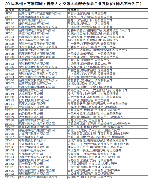 参会单位中,有一定数量的温州知名上市企业和集团公司,并提供大量招聘岗位。涉及机械/设备/重工行业、仪器仪表/工业自动化行业、汽车及零配件行业、服装/纺织/皮革行业、贸易/进出口行业、中介服务行业、家具/家电/工艺品/玩具行业、互联网/电子商务行业、金融/投资/证券行业、批发/零售行业。