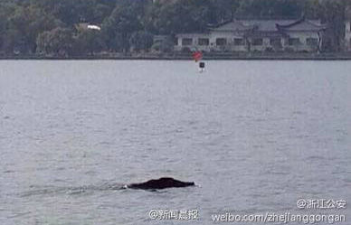昨天中午,学士公园附近的清洁工人老黄发现西湖水中一个物体一浮一沉,她以为是一条大包头鱼,小跑过去一看,天哪,哪里是鱼,竟然是一头正在冬泳的野猪!毛估估大约200斤左右。