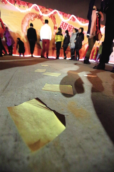 在市区会展中心元宵灯会现场,许愿墙前留下了众多贴纸垃圾。刘伟摄