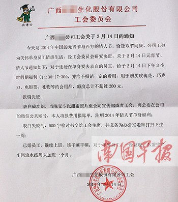 当天,网络上流传着南宁某公司一则情人节放假通知,大致内容是:“今天是2014年中国的元宵节和西方的情人节,恰逢双节同庆,公司工会为关怀单身员工情感生活,经工会委员会研究决定,给予2月14日下午半天的假期福利,并给予报销一定的费用,用于购买玫瑰花、巧克力、电影票、礼物等约会用品,额度总计不超过200元。表白成功的,填报账单报销;表白失败的,500字检讨书交给工会主席”。这则通知引来众多网友称赞,纷纷表示“羡慕嫉妒”——“你们公司还招人吗?”“你们公司管理太人性化了!”“你们公司待遇如何?”