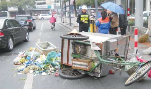昨日早高峰期间,市区莲花路与人民中路丁字路口发生一起车祸——随着刺耳的“嘭、啪!”声响过,一辆环卫车侧翻,环卫工倒地不起,一辆翼虎牌越野车爆胎,“瘫痪”在路上。