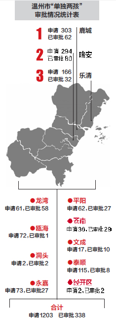 今年1月17日,温州市正式开始实施“单独两孩”政策,符合条件的单独夫妇,经申请审批,可合法生育第二个孩子。昨日,据温州市计生委统计,截至2月17日,全市已有1203对符合条件的夫妇向当地街道(乡镇)办事处提出再生育申请。其中,338对夫妇的申请手续已获审批。鹿城、瑞安、乐清申请人数排在全市各县(市、区)前三。