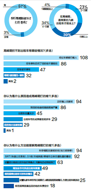 针对高峰时打的话题,温州都市报进行了问卷调查,并收回有效问卷134份。调查显示:九成多受访者在高峰期遇到过打的难。