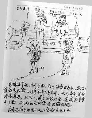 从今年元旦起,王孝贤将漫画搬上了给女儿新买的《日课》本上。这是一套分为春、夏、秋、冬四本的民国老课本,近几年被出版社重新出版,每页的左边是老的民国教材,右边是空白页,正好画画。“买毛笔,也是为了‘配合’左边的民国课本。”正因为此,《圈圈绘画日记》也被不少人盛赞为“好有民国风”。