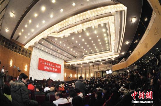 3月4日上午,十二届全国人大二次会议在人民大会堂新闻发布厅举行新闻发布会,由大会发言人就大会议程和人大工作相关的问题回答中外记者的提问。图为发布会开始前的人民大会堂新闻发布厅。中新网记者金硕摄
