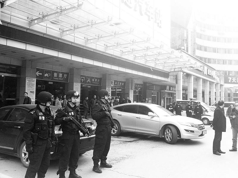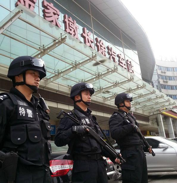 图为:汉口金家墩长途客运站前新增了防爆特警驻守(记者邓伟摄)
