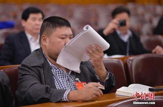 资料图:3月9日,全国政协十二届二次会议在人民大会堂举行全体会议。毛新宇委员会场研读。中新社发廖攀摄