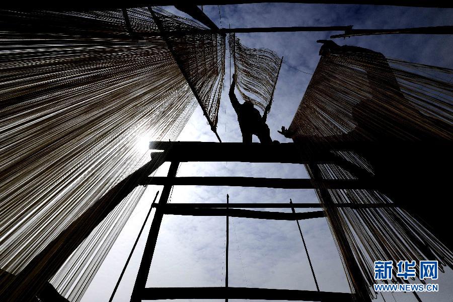 四川省德阳市中江县觉慧村是一个有着40多户人家的普通小村庄,家家户户均以制面为生。每年小雪节气过后,如丝一般的手工面便会出现在村民的房前屋顶。手工制面早已成为觉慧村的名片,人们称它为“挂面村”。制作挂面,不仅成为这个村的名片,也成为当地村民祖祖辈辈沿袭至今的一种生活方式。中江挂面要经过和面、划条、盘条、发酵、抻大条、抻小条、上竹、扑粉、晒面等18道传统工序,一根手工制作的面条,可以拉伸到4米长,不仅不会断裂,而且粗细均匀、细如发丝。目前,中江挂面的制作工艺已被列入四川省非物质文化遗产项目。新华社发(肖开丰摄)
