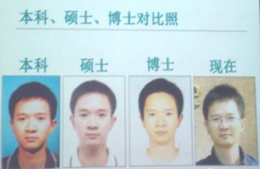 这张一寸照的合辑,分别是本科、硕士、博士以及现在四个阶段的赵教授。从1998到现在,图中的赵教授除了戴上了眼镜,神态、发型、皮肤均无明显变化,就像同时期的一张脸换了四个不同的背景。
