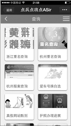 比如点“万能的查询”,会跳出各个栏目。你可以选择想要查询的内容,如“杭州同名查询”(查查杭州有多少人跟你重名)、“护照办理进展”(查查你的护照办到哪一步了)再点进去。