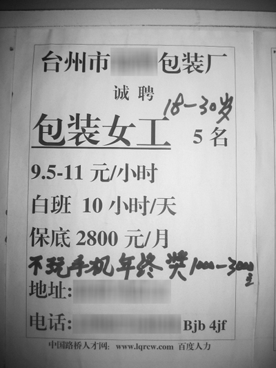 “机不离手”让一些企业主头疼了。近日,记者在台州劳动力市场发现了这么一张招工启事。上面除了介绍工种和基本工资等常规内容外,还有一行用蓝色记号笔专门标注的字:不玩手机者,年终奖励1000到3000元。