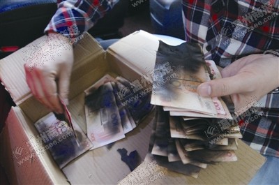 昨天下午,记者在永嘉瓯北五星工业区见到了陈先生和那盒烤焦了的纸钞。打开存钱的盒子,仍然有一股浓重的焦味扑鼻而来。记者请陈先生小心地翻动纸钞,结果其中好几张百元大钞已经“濒临解体”。