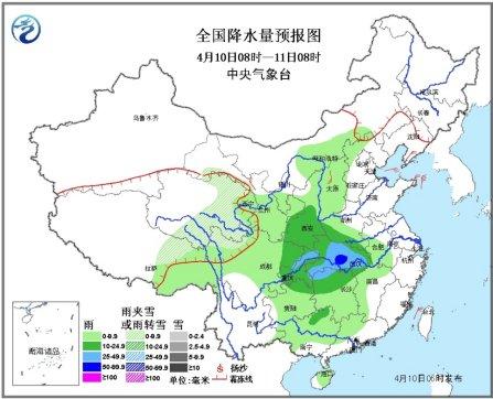 10日08时至11日08时,青藏高原东部的部分地区有小雪或雨夹雪;西北地区东部、内蒙古中西部、华北西部、黄淮西部、西南地区北部和东部、江汉、江淮西部、江南中西部、华南大部等地有小到中雨,其中,重庆北部、湖南西北部、湖北中东部等地的部分地区有大雨,局地暴雨,上述部分地区并伴有雷暴等强对流天气。甘肃西部、东北地区南部、山东半岛等地有4~5级风,甘肃西部、内蒙古西部等地的部分地区有浮尘或扬沙。受冷空气影响,华北等地的部分地区有4~6℃降温。