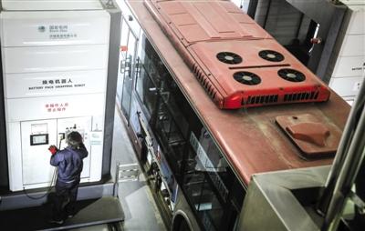 4月3日,天津市海泰电动汽车充换电站,工人正在操作换电机器人给公交车换电池。新京报记者李飞摄