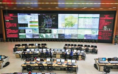 监控城市道路及高速公路拥堵情况并做出路况预测的北京市交通运行监测调度中心(TOCC)内景。