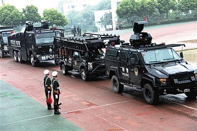 2014年5月14日,四川广安市开展反恐防暴暨应急处突综合实战演练,来自公安战线的特警在进行特种车辆展示。