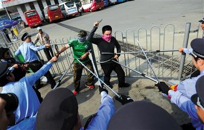 2014年5月9日,济南长途汽车总站举行反恐演练,两名蒙面“歹徒”持刀伤人,车站启动“防暴反恐报警系统”,1分钟内赶到3批反恐力量将“歹徒”制服。