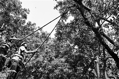 执法组在对一些被查出近期有喷洒农药的杨梅树进行强制落果。杨冰杰摄