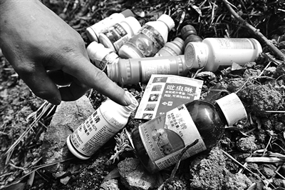 在梅林发现的一些农药瓶子,其中有部分属于在近期采摘期禁用的药品。杨冰杰摄