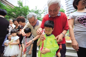 五马街道八仙楼社区的老人们为小朋友点雄黄送蛋袋。刘伟摄