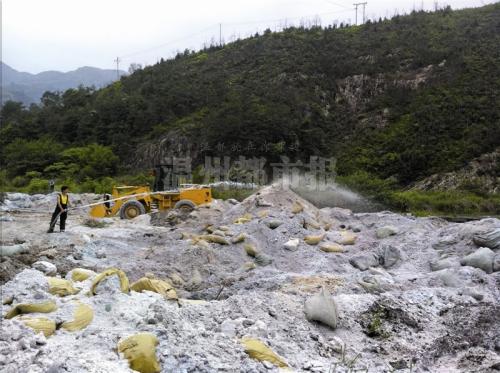 当天,桥头镇环保所和城管执法人员接到村民举报,正在联合组织清运这些粉末。“有人在晚上偷偷倾倒,平时很难监管。”一名城管执法人员说,这些粉末估计有500来吨,全部清理需要两三天时间。下雨天,这些粉末会被雨水冲入菇溪,河面因此变成乳白色。
