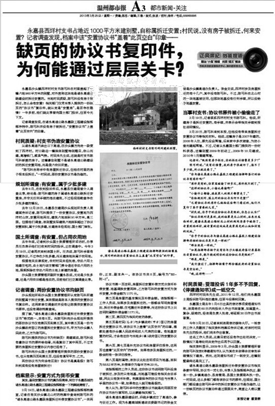 去年3月,温州都市报曝光了沙头镇西垟村村支书陈剑伪造安置协议,违法建别墅,总占地面积960.8平方米(其中建筑占地面积174.3平方米)一事。此后,当地纪委介入调查,陈剑被免职,违法建设存续期间的责任人沙头规划所所长、沙头国土资源管理所原所长(时任该县国土局土地登记中心主任)被免职。