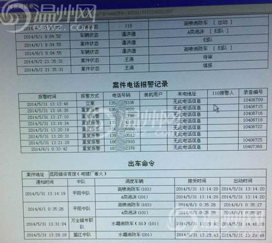 记者从平阳消防获悉,在5月31日下午1点多火灾发生后,1点13分48秒,平阳消防接到第一个报警电话,至13点21分38秒,在不到8分钟内,平阳消防总共接到7个报警电话(该报道记者号码为156****6880,为第5个报警号码),同时,还有几十个报警电话因线路忙而没有打通,在排队等待,与记者所说的10分钟内仅2人拨打119电话不符。