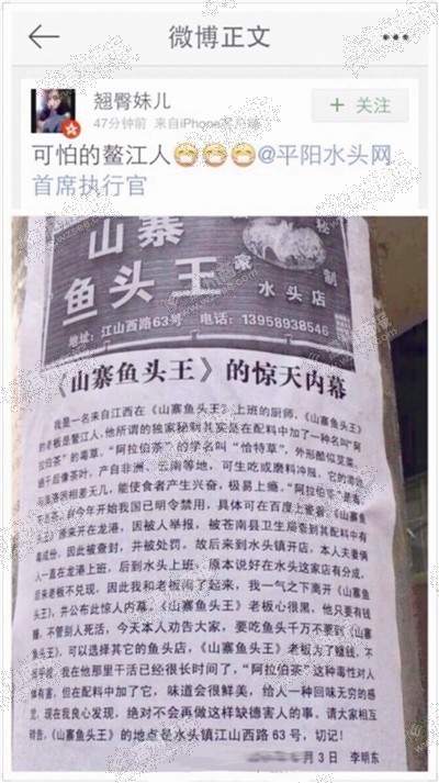 街头传单曝“山寨鱼头王”配料用毒草