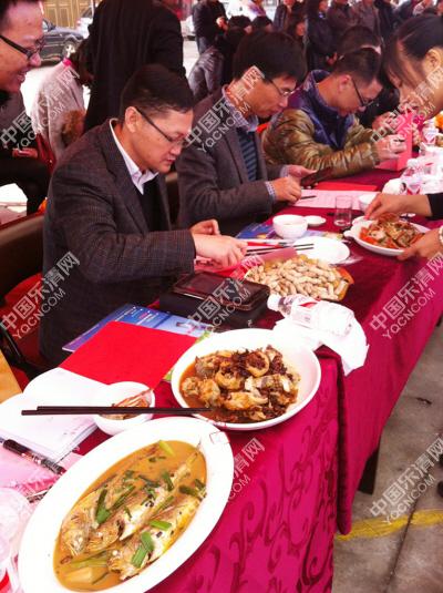 不一会儿,第一道菜出锅了,工作人员将成品菜端至评委席前。有口福的第一位评委,夹一小块送入口中,品一小会儿,点头微笑,略作思考,便开始给选手打分。工作人员刚将这道菜传至下一位评委桌前。紧接着第二道菜又出锅了。