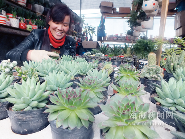 温州网瓯海支站讯 近段时间,PM2.5超标、雾霾天持续、空气质量下降,成为全民关注的焦点。如何改善室内空气质量,成为不少人关心的话题。记者走访发现,具有净化空气作用的绿色小盆栽,近来大受市民和办公室白领追捧。大家纷纷选择芦荟、仙人球等体积小、抗辐射的多肉植物来净化工作环境。