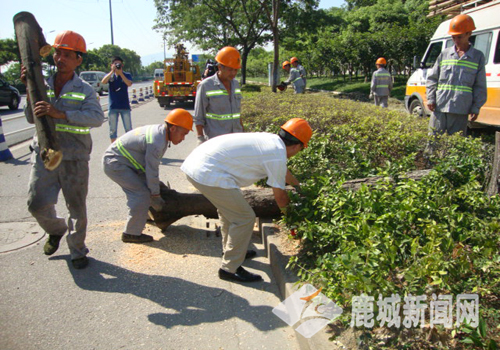 当天下午,鹿城区园林绿化管理处接到群众反映“会展路万丰达塑料厂往北20米处有两株行道树被台风刮倒在地,影响交通”,园林处立即启动行道树突发事件应急预案。应急抢险队第一时间赶到事故现场,及时设置警示标识及反光路锥,对事故突发点实施临时围蔽,做好险情区域隔离与交通疏导等工作。运输组调配运输车、吊车也随后赶到。在现场,应急抢险队搜寻有无人员受伤,排查电线及地下管线等影响抢险操作的危险情况是否存在,然后对影响交通的树枝进行截枝,对树干砍伐,最后装车运离现场。行道树刮倒影响交通的突发事故得到有效解决。